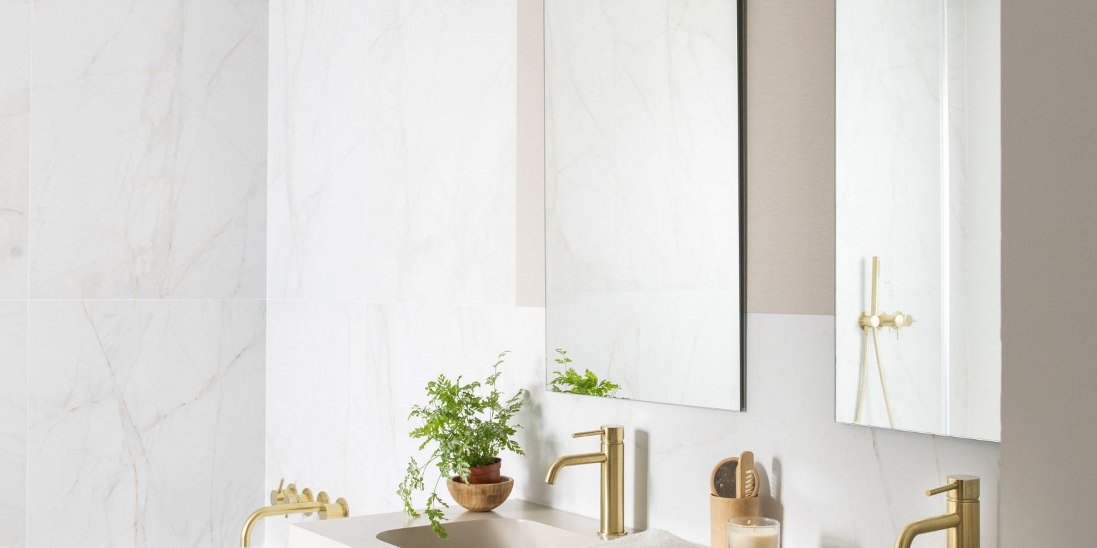 En aquest espai, amb aixetes de la casa Rovira en acabat or raspallat, subministrada per Catalonia Ceramic, aporta un toc de luxe i caràcter. La col·lecció inclou peces com el ruixador de sostre, el monocomandament o encastat de dues vies i el canal de paret rodó, que reforcen l'estètica sofisticada del conjunt. El moble Unibaño de quatre calaixos en acabat Alabama afegeix funcionalitat i calidesa, mentre que els revestiments Storm Cream d'Argenta i Marble Dolomita Gold Mate de Roca creen una atmosfera relaxant i harmoniosa. Acaba de dibuixar aquesta zona la banyera Torino Angolo de Sanycces i que ofereix una presència molt elegant i totalment atemporal.