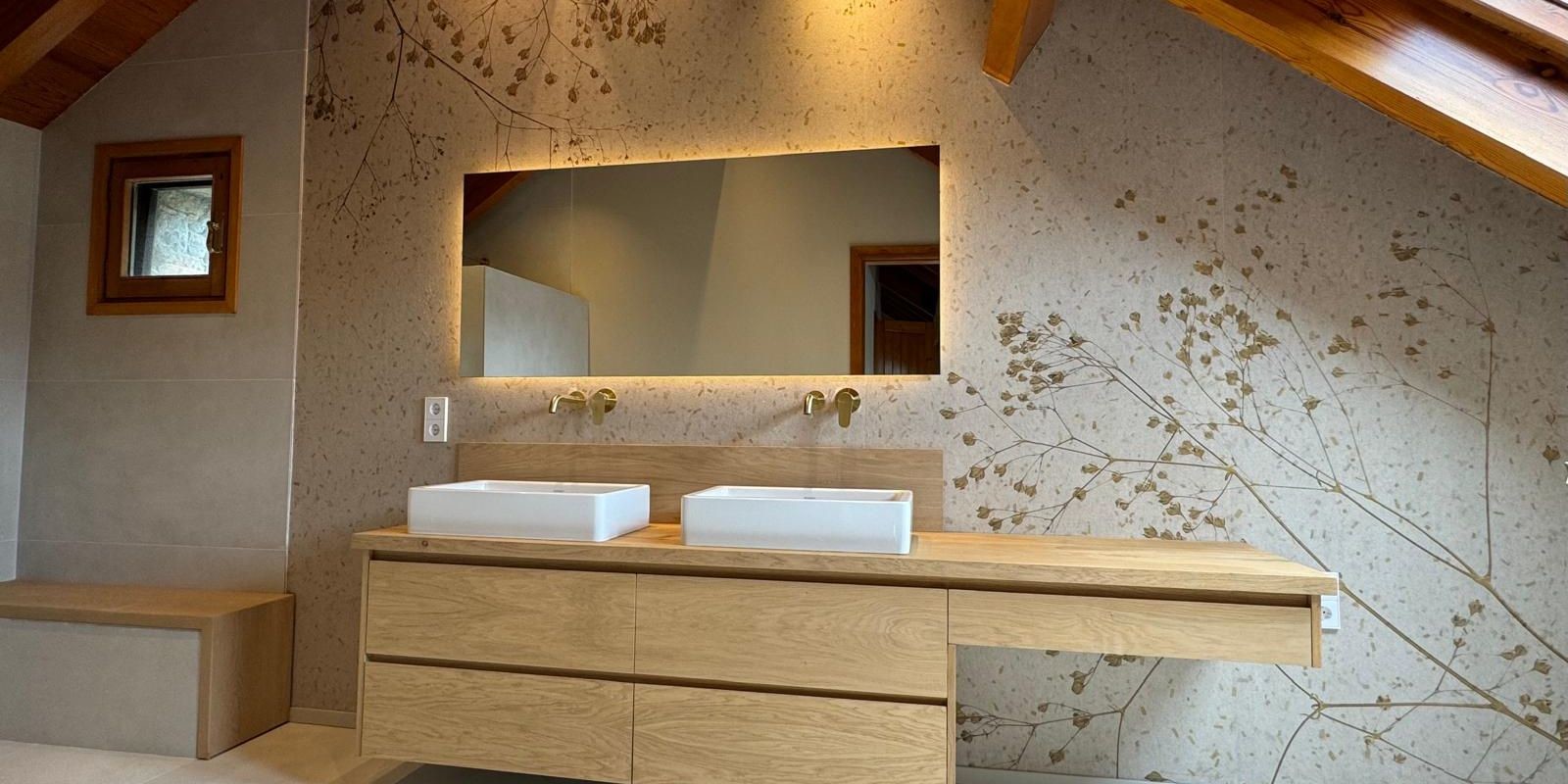 Para el suelo y las paredes de este baño de grandes dimensiones se han elegido baldosas de la marca Mirage en color gris claro, que también dan forma al nicho de la ducha. Para vestir la pared principal —donde se sitúan el mueble de baño, los lavabos y el espejo retroiluminado— se ha escogido el papel pintado KomorebiCollection de la firma Glamora. Esta marca elabora todos sus murales con fibras de vidrio y poliéster, lo que garantiza durabilidad y resistencia a la humedad, con impresiones digitales de alta calidad que sorprenden por su precisión. Toda la colección de Glamora, disponible en los distintos showrooms de CataloniaCeramic, está diseñada para crear ambientes únicos y personalizados.