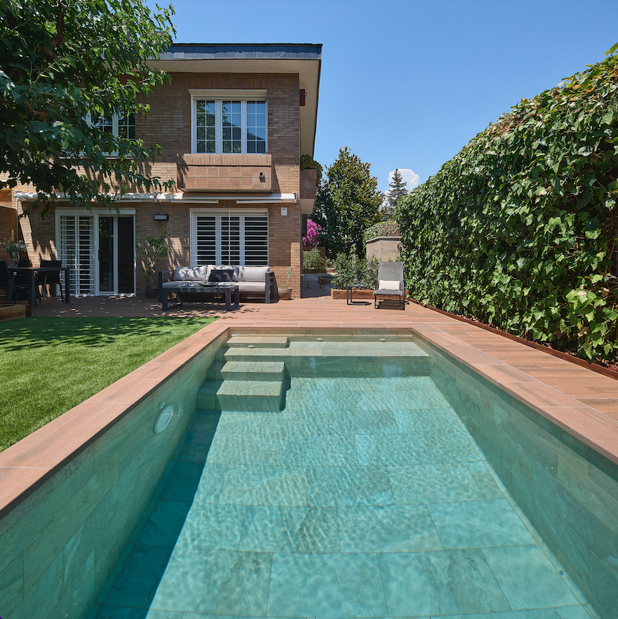 Para el exterior se ha elegido la colección Alma Forest, en acabado antideslizante, una cerámica que imita la calidez de la madera y se funde con los ladrillos de obra vista de la casa, con una tonalidad similar, lo que crea una sensación de armonía y de continuidad. Para el interior de la piscina, en cambio, la protagonista es la línea Pietro Golden, una cerámica de tonos arena y reflejos dorados que cambia la percepción del color del agua, aportando un tono turquesa y muy luminoso. Las cerámicas rectangulares, de gran formato tipo lama, se han instalado con una junta mínima para extender una sensación de prolongación visual entre la zona de la terraza y la piscina. Una combinación, que sigue la estética mix and match, especialmente creada para diseñar espacios con personalidad propia y que ofrece un fácil mantenimiento.