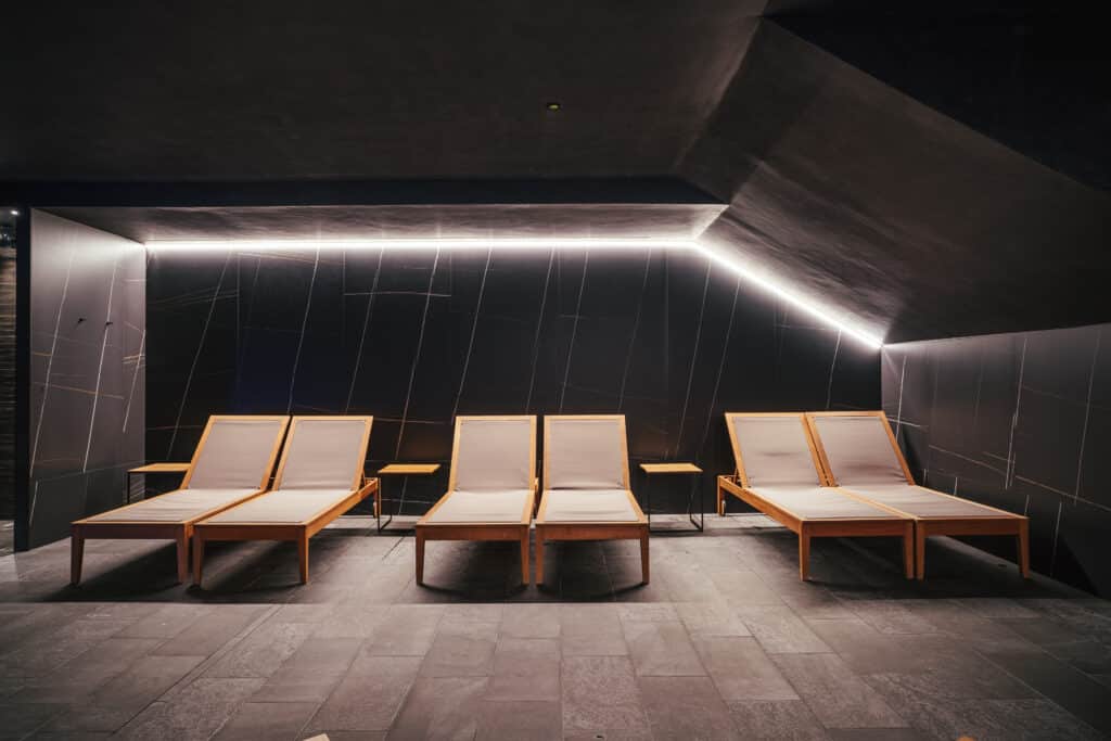 Pel material de la piscina s’ha escollit Rosa Gres, amb els models Trésor Bali i Trésor Java, creant un ambient exòtic i sofisticat que convida a la relaxació i al benestar.