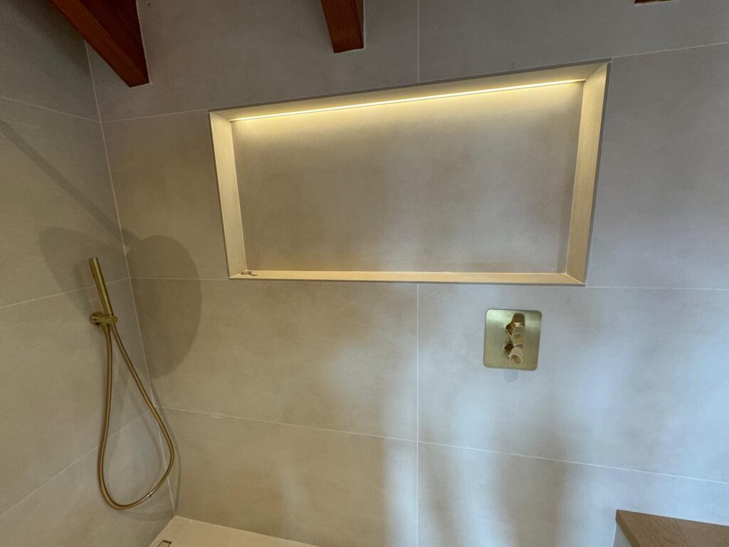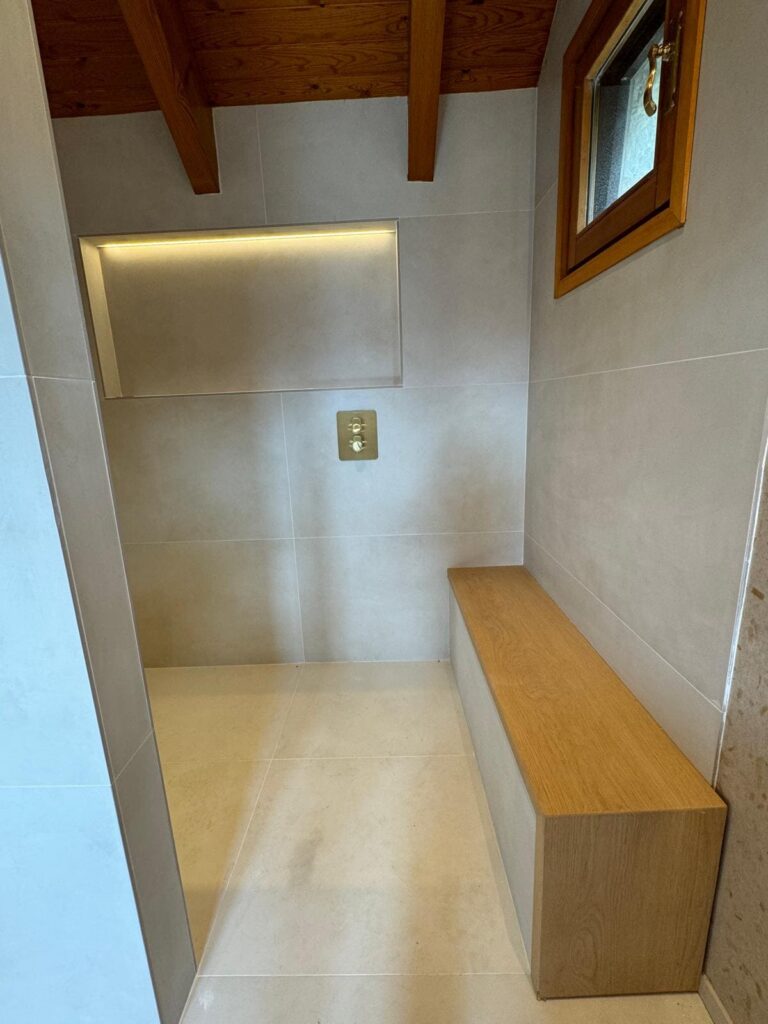 Aquest bany d’alt nivell es concep com un refugi de pau a les golfes d’una casa de muntanya, on la fusta, les bigues i la llum natural defineixen l’ambient. Els materials naturals i els colors neutres es combinen amb il·luminació càlida per generar una atmosfera elegant i acollidora. La ceràmica de gran format de la marca Mirage gris clar recobreix paviments i parets, mentre un mur amb paper pintat de la col·lecció Glamora aporta textura i personalitat.
