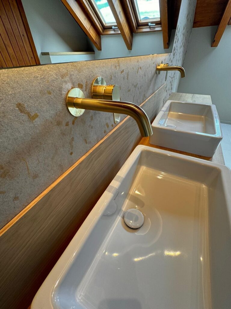 La combinació de detalls com l’aixeta daurada de Ramón Soler i el sistema de sanitaris de Geberit reforcen la qualitat funcional i estètica de l’espai.